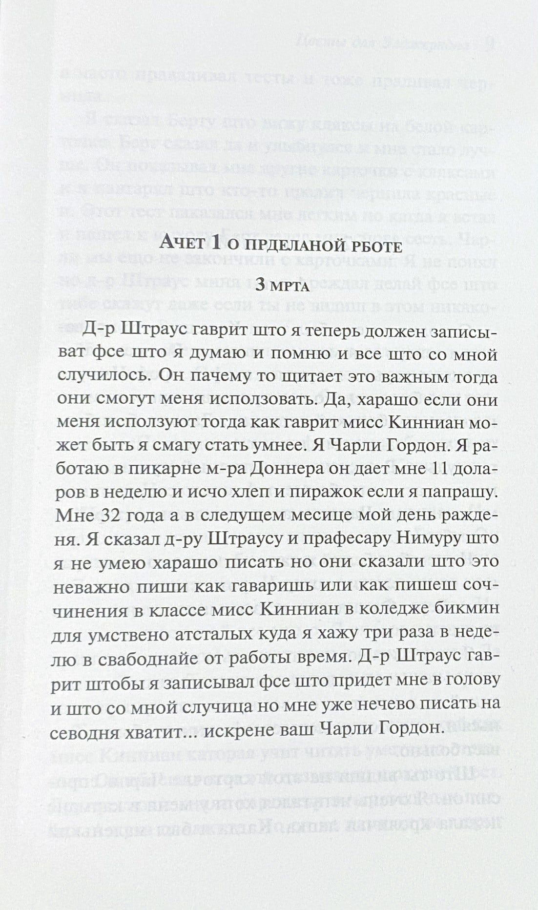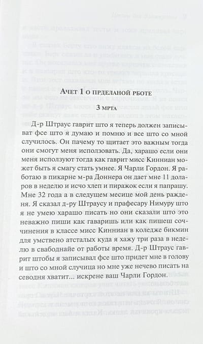 Изменения с Чарли Гордоном происходят на наших глазах, здесь и сейчас. В первых отчетах полно орфографических ошибок, ему очень трудно излагать свои мысли, постепенно он начинает писать правильно и рассказывать о событиях идеально.