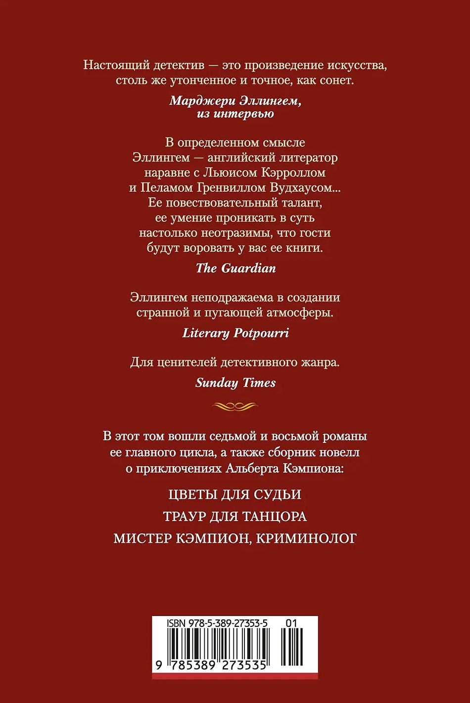Наибольшую известность приобрели книги Эллингем о сыщике-джентльмене Альберте Кэмпионе. В этот том вошли седьмой и восьмой романы ее главного цикла, а также сборник новелл «Мистер Кэмпион, криминолог».