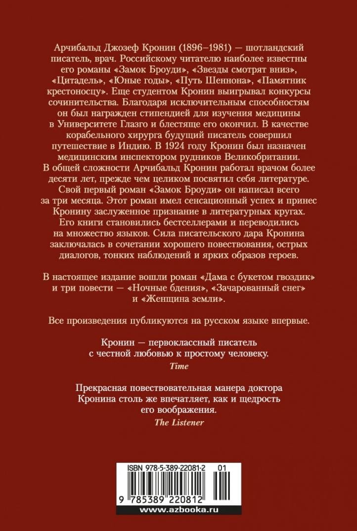 За миниатюру Гольбейна, известную как «Дама с букетом гвоздик», разворачивается настоящее сражение на лондонском аукционе. Кэтрин Лоример удается обойти соперников, однако вместо триумфа она чувствует тревогу и опустошенность. Затея с миниатюрой — это огромная авантюра, и если она не удастся, Кэтрин окажется на грани разорения. К тому же Кэтрин одинока: самый дорогой ей человек, племянница, вскоре выйдет замуж и покинет ее. Портрет красивой, но несчастной женщины завораживает новую владелицу… Но не случится ли так, что она сама повторит судьбу гольбейновской модели? Помимо романа «Дама с букетом гвоздик», в сборник вошли три повести известного писателя — «Ночные бдения», «Зачарованный снег» и «Женщина земли».