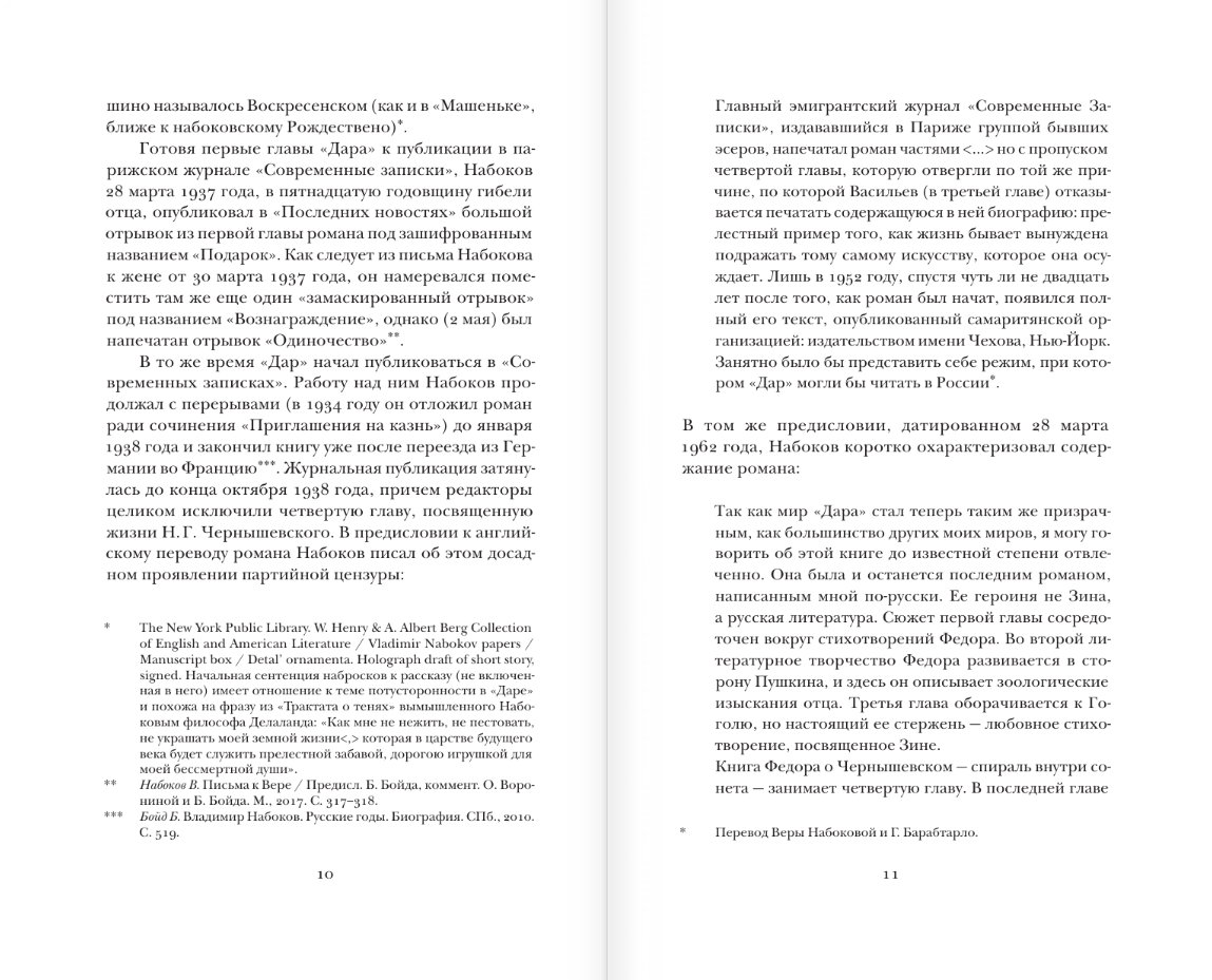 «Дар» (1938) — последний завершенный русский роман Владимира Набокова и один из самых значительных и многоплановых романов XX века. Создававшийся дольше и труднее всех прочих его русских книг, он вобрал в себя необыкновенно богатый и разнородный материал, удержанный в гармоничном равновесии благодаря искусной композиции целого. «Дар» посвящен нескольким годам жизни молодого эмигранта Федора Годунова-Чердынцева — периоду становления его писательского дара, — но в пространстве и времени он далеко выходит за пределы Берлина 1920 х годов, в котором разворачивается его действие. В нем наиболее полно и свободно изложены взгляды Набокова на искусство и общество, на истинное и ложное в русской культуре и общественной мысли, на причины упадка России и на то лучшее, что остается в ней неизменным.