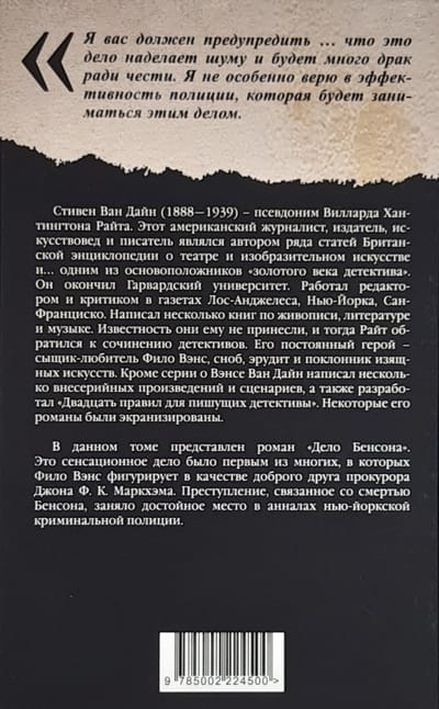 Стивен Ван Дайн (1888—1939) — псевдоним Вилларда Хантингтона Райта. Этот американский журналист, издатель, искусствовед и писатель являлся автором ряда статей Британской энциклопедии о театре и изобразительном искусстве и... одним из основоположников «золотого века детектива». Он окончил Гарвардский университет. Работал редактором и критиком в газетах Лос-Анджелеса, Нью-Йорка, Сан-Франциско. Написал несколько книг по живописи, литературе и музыке. Известность они ему не принесли, и тогда Райт обратился к сочинению детективов. Его постоянный герой — сыщик-любитель Фило Вэнс, сноб, эрудит и поклонник изящных искусств. Кроме серии о Вэнсе Ван Дайн написал несколько внесерийных произведений и сценариев, а также разработал «Двадцать правил для пишущих детективы». Некоторые его романы были экранизированы. В данном томе представлен роман «Дело Бенсона». Это сенсационное дело было первым из многих, в которых Фило Вэнс фигурирует в качестве доброго друга прокурора Джона Ф. К. Маркхэма. Преступление, связанное со смертью Бенсона, заняло достойное место в анналах нью-йоркской криминальной полиции.