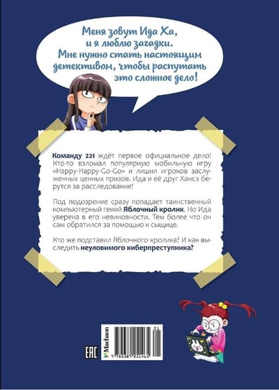 Команду 221 ждет первое официальное дело! Кто-то взломал игру «Happy-happy-go-go» и лишил игроков заслуженных ценных призов. Ида и её друг Хансэ берутся за расследование! Под подозрение сразу попадает таинственный компьютерный гений Яблочный кролик. Но Ида уверена в его невиновности. Тем более что он сам обратился за помощью к сыщице. Кто же подставил Яблочного кролика? И как выследить неуловимого киберпреступника?