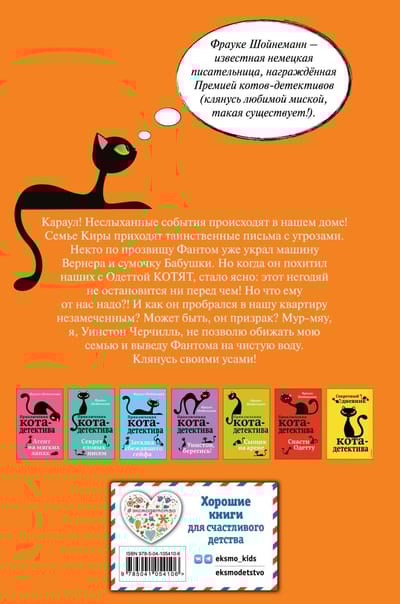 Просто невероятно! Самый известный кот-детектив Уинстон Черчилль снова берётся за дело! А всё потому, что его семья оказалась в опасности. Некто по прозвищу Фантом шлёт Кире и её родным письма с угрозами. Сначала таинственный злоумышленник украл машину Вернера и сумочку Бабушки, а потом… КОТЯТ Одетты и Уинстона! Усатый сыщик страшно зол: никто не смеет обижать его малышей! Он просто обязан найти их и разоблачить Фантома. Вот только как же его поймать, если он невидим и не оставляет следов?
