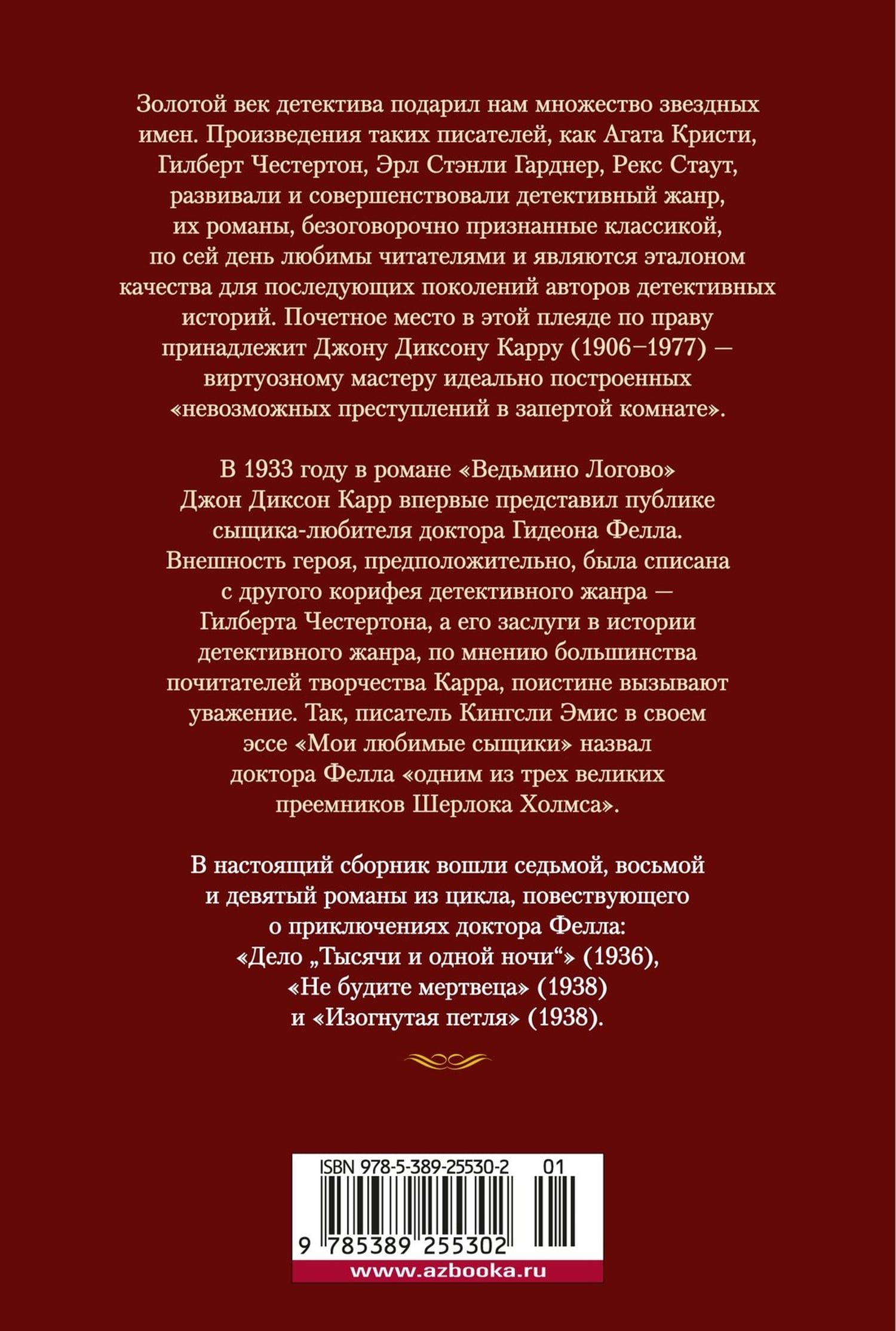В настоящий сборник вошли седьмой, восьмой и девятый романы из цикла, повествующего о приключениях доктора Фелла: «Дело „Тысячи и одной ночи“» (1936), «Не будите мертвеца» (1938) и «Изогнутая петля» (1938).
