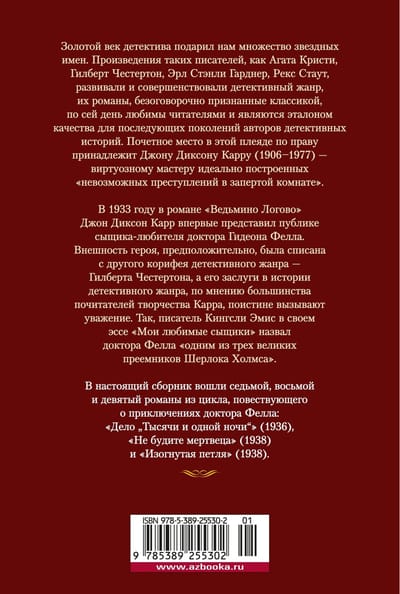 Золотой век детектива подарил нам множество звездных имен. Произведения таких писателей, как Агата Кристи, Гилберт Честертон, Эрл Стэнли Гарднер, Рекс Стаут, развивали и совершенствовали детективный жанр, их романы, безоговорочно признанные классикой, по сей день любимы читателями и являются эталоном качества для последующих поколений авторов детективных историй. Почетное место в этой плеяде по праву принадлежит Джону Диксону Карру (1906–1977) — виртуозному мастеру идеально построенных «невозможных преступлений в запертой комнате». В 1933 году в романе «Ведьмино Логово» Джон Диксон Карр впервые представил публике сыщика-любителя доктора Гидеона Фелла. Внешность героя, предположительно, была списана с другого корифея детективного жанра — Гилберта Честертона, а его заслуги в истории детективного жанра, по мнению большинства почитателей творчества Карра, поистине вызывают уважение. Так, писатель Кингсли Эмис в своем эссе «Мои любимые сыщики» назвал доктора Фелла «одним из трех великих преемников Шерлока Холмса».