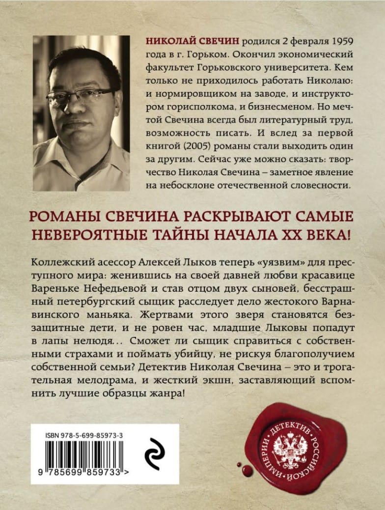 Коллежский асессор Алексей Лыков теперь «уязвим» для преступного мира: женившись на своей давней любви красавице Вареньке Нефедьевой и став отцом двух сыновей, бесстрашный петербургский сыщик расследует дело жестокого Варнавинского маньяка. Жертвами этого «зверя» становятся беззащитные дети, и, неровен час, младшие Лыковы попадут в лапы нелюдя… Сможет ли сыщик справиться с собственными страхами и поймать убийцу, не рискуя благополучием собственной семьи? Детектив Николая Свечина – это и трогательная мелодрама, и жесткий экшн, заставляющий вспомнить лучшие образцы жанра!