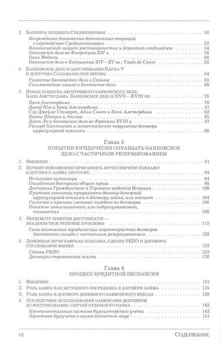 Книга посвящена всестороннему рассмотрению центрального института современного экономического порядка - банковского дела на началах частичного резервирования с центральным банком и роли этого института в периодически повторяющихся экономических циклах. Автор анализирует эту проблему с юридической, исторической и экономической точек зрения. Главы 1-3 посвящены юридическим и историческим аспектам банковского дела с частичным резервированием. В главах 4-7 подробно объясняется, каким образом нарушение универсальных принципов права, выражающееся в ведении банковского дела на началах частичного резервирования, неизбежно ведет к кредитной экспансии и циклу бум-крах. Здесь Уэрта де Сото излагает и развивает подход австрийской экономической школы (Л. Мизес, Ф. Хайек, М. Ротбард). Глава 8 посвящена разбору теорий, обосновывающих необходимость центрального банка и допустимость банковского дела с частичным резервированием. В завершающей 9-й главе книги автор обсуждает проблему реформирования современной денежной системы, базирующейся на сочетании неразменных денег и банковского дела с частичным резервированием, находящихся под контролем центрального банка, выступая с собственным планом.