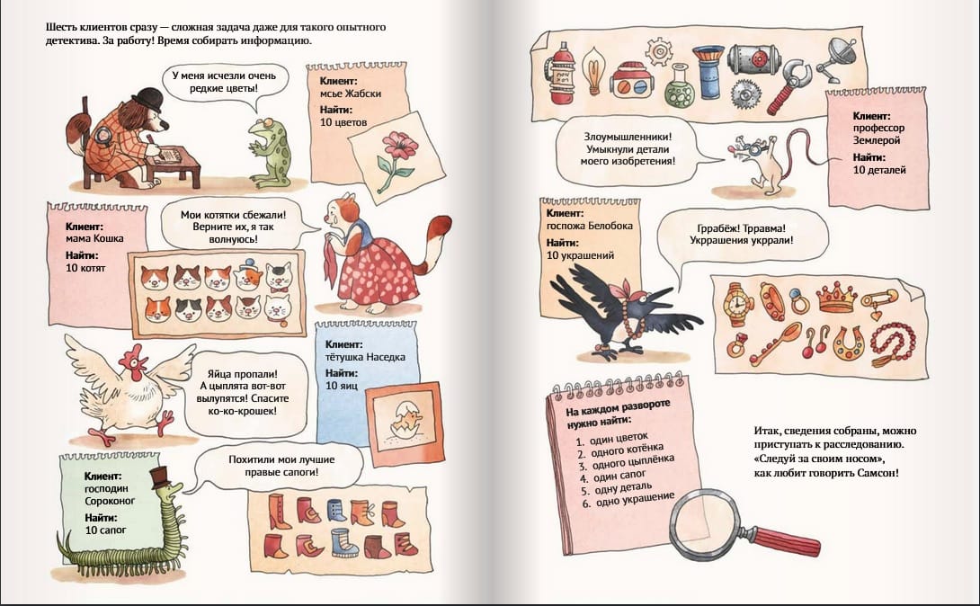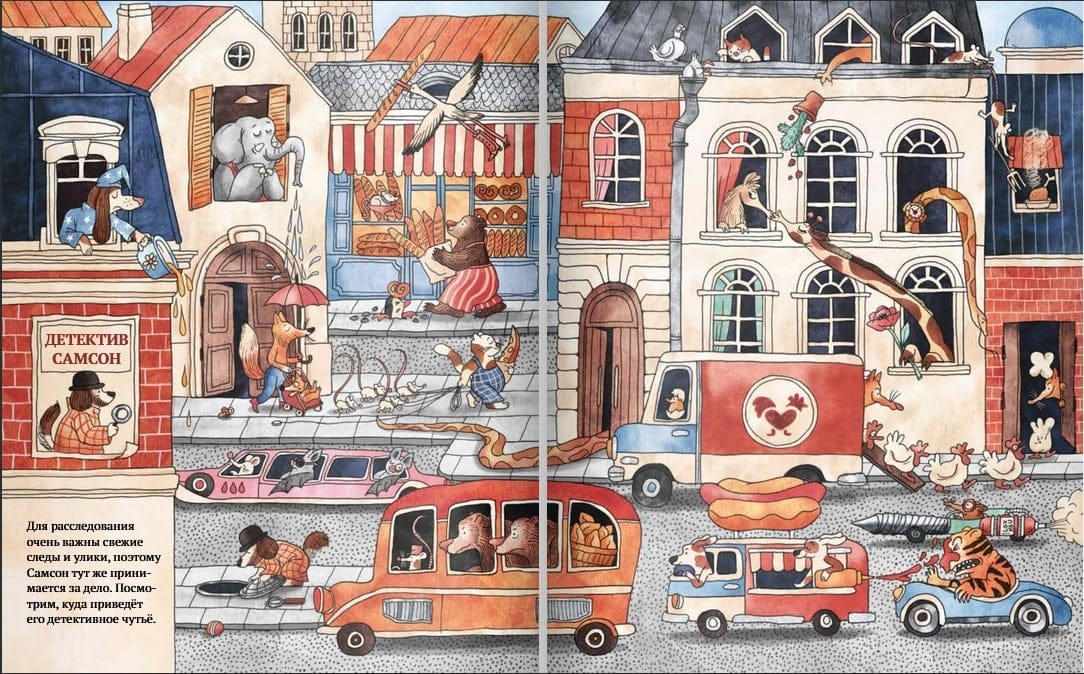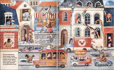 В городе творится что-то странное, а значит у детектива Самсона впереди насыщенный день: сложные дела и запутанные тайны — его призвание. Недаром он самый популярный сыщик в округе! В поисках улик ему предстоит побывать на шумных улицах и в затопленной пещере, под палящим солнцем на пляже и у заснеженных горных вершин — пока другие отдыхают, Самсон действует! «Детектив Самсон» — остроумный, смешной и увлекательный виммельбух, который придумала и нарисовала Катерина Горелик. Настоящая детективная игра для всей семьи!