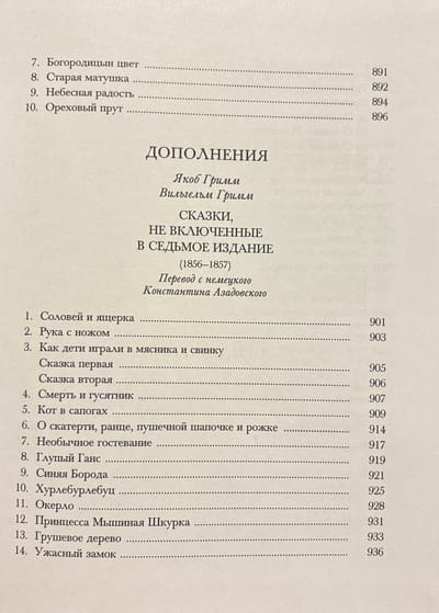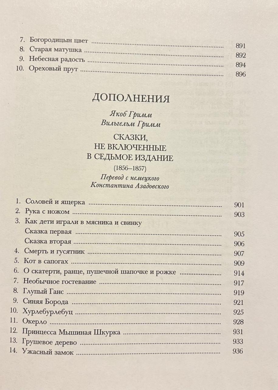 Имена братьев Гримм, Якоба (1785—1863) и Вильгельма (1786—1859), великих немецких фольклористов, авторов знаменитейших «Детских и домашних сказок», известны, пожалуй, каждому с самого раннего детства. Но мало кто догадывается, что на русском языке данное собрание никогда должным образом издано не было. Наполненные жизнью, хранящие соль земли, породившей их, эти замечательные истории на протяжении полувека бережно записывались братьями, одержимыми любовью к слову, наследию предков, созидающей силе народного гения. Сказки были сохранены от забвения, став бесценным достоянием всего человечества. Одно из высших достижений немецкого романтизма, данный сборник перевернул историю сказки, вдохновил собирателей многих стран, породил плеяду замечательных исследователей, стимулировал развитие новых научных дисциплин, раз и навсегда изменил детскую литературу. Публикуемый в настоящем издании перевод — это итог многолетнего, начатого еще в 1970-е годы, подвижнического труда одного из лучших отечественных переводчиков К.М. Азадовского. Ему удалось сохранить ту свежесть и живость, ту великую простоту, которыми отмечены знаменитые сказки, передать уникальный стиль, снискавший даже особое название «гриммовского». Переведенные колоритным языком, сохранившие животворный дух, пропитанный отголосками исконной германской мифологии, сказки вместе с тем счастливо избежали чрезмерной русификации, что присуще большинству известных переводов.