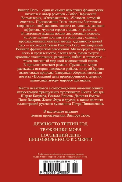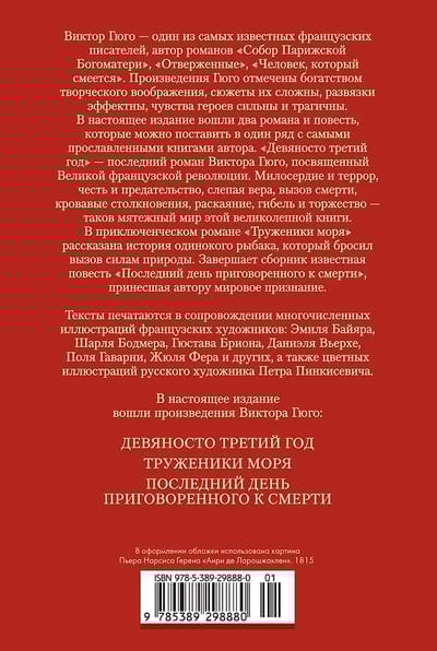 «Девяносто третий год» — последний роман Виктора Гюго, посвященный Великой французской революции. Милосердие и террор, честь и предательство, слепая вера, вызов смерти, кровавые столкновения, раскаяние, гибель и торжество — таков мятежный мир этой великолепной книги.