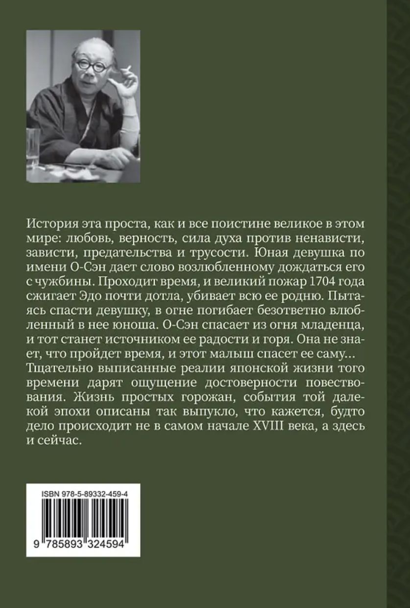 История эта проста, как и все поистине великое в этом мире: любовь, верность, сила духа против ненависти, зависти, предательства и трусости. Юная девушка по имени О-Сэн дает слово возлюбленному дождаться его с чужбины. Проходит время, и великий пожар 1704 года сжигает Эдо почти дотла, убивает всю ее родню. Пытаясь спасти девушку, в огне погибает безответно влюблённый в нее юноша. О-Сэн спасает из огня младенца, и тот станет источником ее радости и горя. Она не знает, что пройдет время, и этот малыш спасёт ее саму…