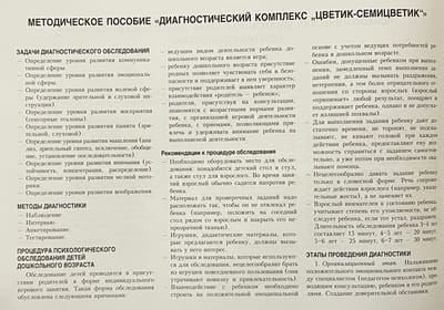 Диагностический альбом «Цветик-семицветик» - это комплекс диагностических методик, предназначенный для исследования развития психических процессов и индивидуальных особенностей детей дошкольного возраста. В альбоме подробно описана процедура психологической диагностики, рассмотрены психологические особенности детей дошкольного возраста, а также приведены возрастные нормы психического развития дошкольников: восприятия, памяти, внимания, воображения, интеллекта и психофизиологической сферы. Методические рекомендации сопровождаются объемным диагностическим инструментарием.