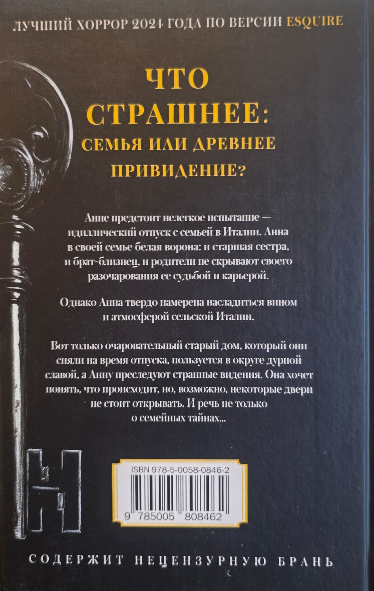 Анне предстоит нелегкое испытание – идиллический отпуск с семьей в Италии. Анна в своей семье белая ворона: и старшая сестра, и брат-близнец, и родители не скрывают своего разочарования ее судьбой и карьерой. Однако Анна твердо намерена насладиться вином и атмосферой сельской Италии. Вот только очаровательный старый дом, который они сняли на время отпуска, пользуется в округе дурной славой, а Анну преследуют странные видения. Она хочет понять, что происходит, но, возможно, некоторые двери не стоит открывать. И речь не только о семейных тайнах…