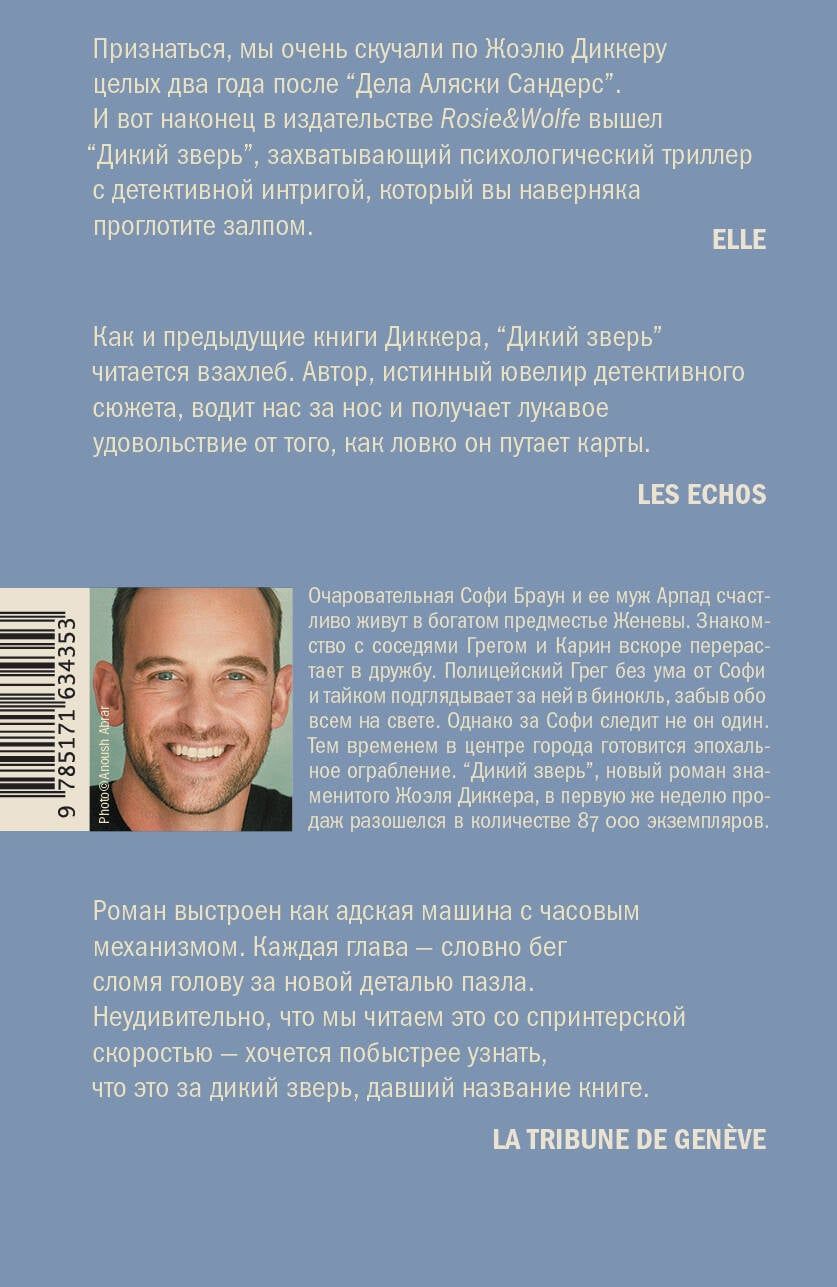 За десятилетие, прошедшее после публикации бестселлера «‎Правда о деле Гарри Квеберта»‎, молодой швейцарец Жоэль Диккер, лауреат Гран-при Французской академии и Гонкуровской премии лицеистов, стал всемирно признанным мастером психологического детектива. Общий тираж его книг, переведенных на сорок языков, превышает 15 миллионов. Седьмой его роман, «‎Дикий зверь»‎, едва появившись на прилавках, за первую же неделю разошелся в количестве 87 000 экземпляров.