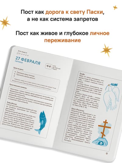 Готовишься к празднику Светлого Христова Воскресения впервые? «Дневник первого поста» станет твоим мудрым проводником, который поможет пройти путь Великого поста осознанно и со всей душой. Этот дневник создан для того, чтобы ты мог взять его с собой куда угодно, например в дорогу, на службу, или оставить на прикроватном столике. Он поможет сохранить фокус и осмысленность даже в повседневной суете. Пусть дни Великого поста станут временем внутреннего обновления, а дневник — добрым другом и поддержкой на этом прекрасном пути к встрече с Пасхой.