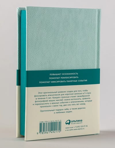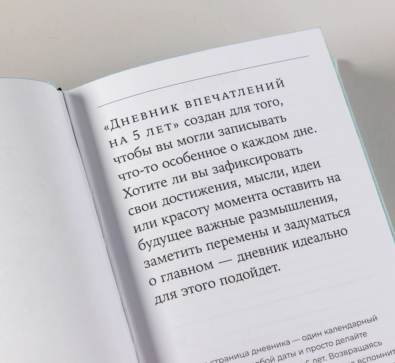 «Дневник впечатлений на 5 лет» создан для того, чтобы вы могли записывать что-то особенное о каждом дне. Хотите ли вы зафиксировать свои достижения, мысли, идеи или красоту момента, оставить на будущее важные размышления, заметить перемены и задуматься о главном - дневник идеально для этого подойдет. Каждая страница дневника - один календарный день. Начните с любой даты и просто делайте записи ежедневно в течение 5 лет. Возвращаясь к уже заполненным страницам, вы снова вспомните события, мысли и впечатления той же даты год, два, три, четыре, пять лет назад.