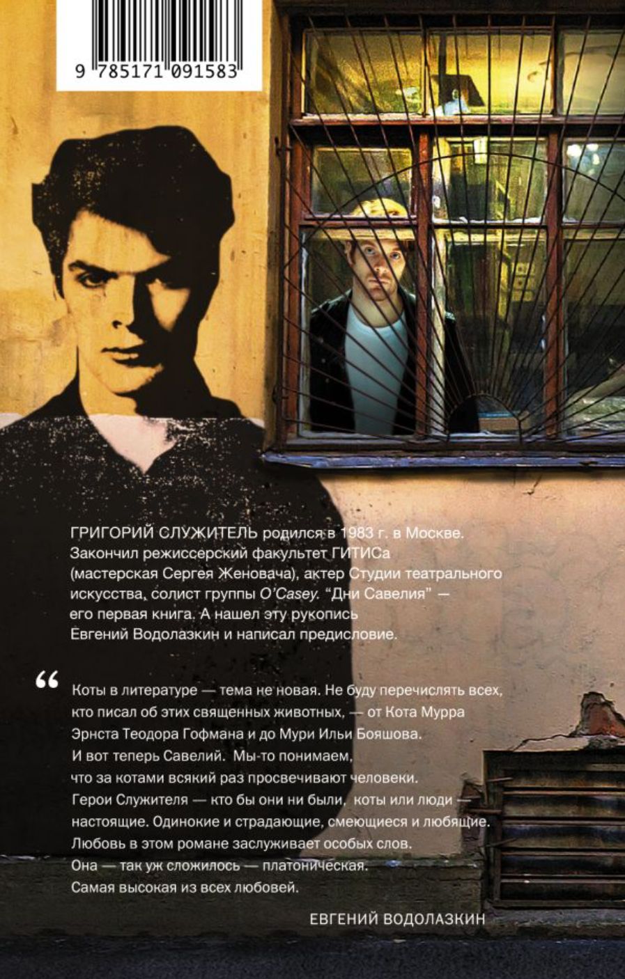 Григорий Служитель родился в 1983 г. в Москве. Окончил режиссерский факультет ГИТИСа (мастерская Сергея Женовача), актер Студии театрального искусства, солист группы O’Casey. «Дни Савелия» — его первая книга, роман вошел в лонг‑лист премии «НОС». А нашел эту рукопись Евгений Водолазкин и написал предисловие.