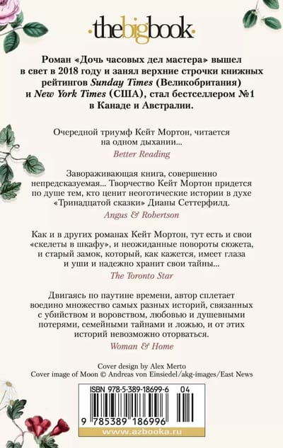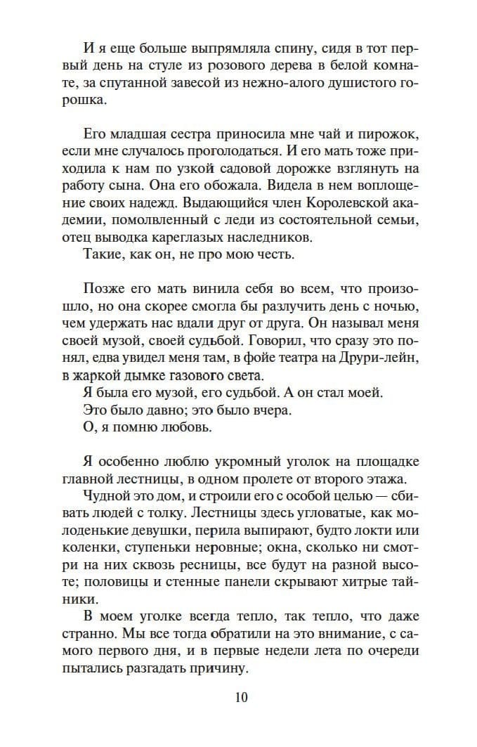 В своей книге Кейт Мортон, автор международных бестселлеров, в числе которых романы «Когда рассеется туман», «Далекие часы», «Забытый сад» и др., пишет об искусстве и любви, тяжких потерях и раскаянии, о времени и вечности, а также о том, что единственный путь в будущее порой лежит через прошлое.