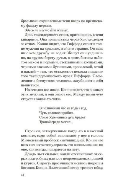 1912 год, Сассекс. В двенадцатилетнем возрасте Конни Гиффорд упала с лестницы и выжила лишь чудом. Теперь ей двадцать два, но она до сих пор не помнит ничего, что происходило с ней до страшного инцидента, кроме отдельных смутных обрывков. Конни живет со своим опустившимся отцом, некогда известным таксидермистом, в уединенном доме на заливаемых морем прибрежных пустошах. Однажды девушка находит в ручье неподалеку тело утопленницы, и к ней постепенно начинает возвращаться память, но эти воспоминания не менее опасны, чем поднимающаяся к дому Гиффордов вода, грозящая гибелью его обитателям.