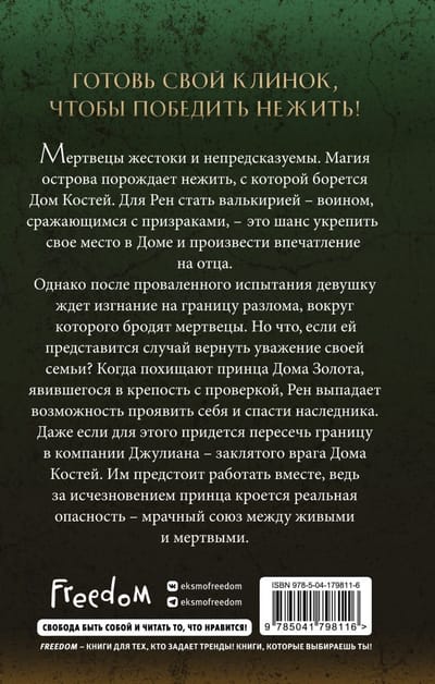 Новая серия о нежити и отважной героине, которая отправляется в призрачную пустошь, чтобы спасти похищенного наследника. Мертвецы жестоки и непредсказуемы. Магия острова порождает нежить, с которой борется Дом Костей. Для Рен стать валькирией — воином, сражающимся с призраками — это шанс укрепить свое место в доме и произвести впечатление на отца. Однако, после проваленного испытания, девушку ждет изгнание на границу разлома, вокруг которого бродят мертвецы. Но что, если ей представится случай вернуть уважение своей семьи? Когда похищают принца Дома Золота, явившегося в крепость с проверкой, Рен выпадает возможность проявить себя и спасти наследника. Даже если для этого придется пересечь границу в компании Джулиана — заклятого врага Дома Костей. Им предстоит работать вместе, ведь за исчезновением принца кроется реальная опасность — мрачный союз между живыми и мертвыми. Дерзкая героиня в духе Селены из серии Сары Дж. Маас «Стеклянный трон». Любовная линия «от ненависти до любви», некроманты, магия, сражения, борьба за власть.