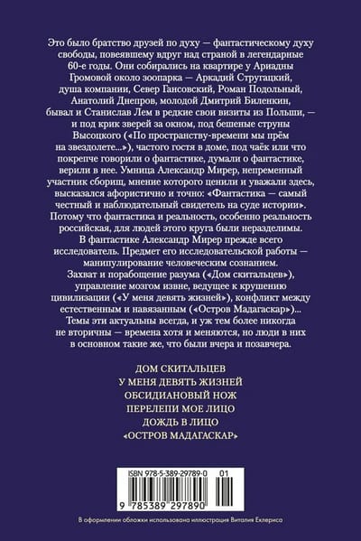 Это было братство друзей по духу — фантастическому духу свободы, повеявшему вдруг над страной в легендарные 60-е годы. Они собирались на квартире у Ариадны Громовой около зоопарка — Аркадий Стругацкий, душа компании, Север Гансовский, Роман Подольный, Анатолий Днепров, молодой Дмитрий Биленкин, бывал и Станислав Лем в редкие свои визиты из Польши, — и под крик зверей за окном, под бешеные струны Высоцкого («По пространству-времени мы прём на звездолете…»), частого гостя в доме, под чаёк или что покрепче говорили о фантастике, думали о фантастике, верили в нее. Умница Александр Мирер, непременный участник сборищ, мнение которого ценили и уважали здесь, высказался афористично и точно: «Фантастика — самый честный и наблюдательный свидетель на суде истории». Потому что фантастика и реальность, особенно реальность российская, для людей этого круга были неразделимы.