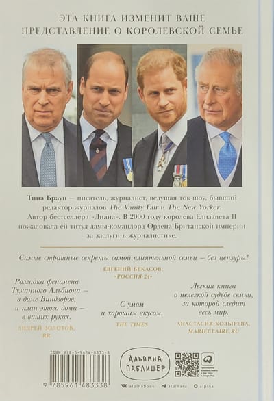 Бывший главный редактор Tatler, Vanity Fair и The New Yorker, автор бестселлера «Диана» в своей новой книге рассказывает, как британская монархия пытается выжить в XXI веке. Работая над ней, Тина Браун поговорила с 120 респондентами, которые лично знают членов королевской семьи и приближенных ко двору. Ее герои — Камилла, Чарльз, Филипп, Маргарет, Эндрю и новое поколение — Уильям, Гарри, Кейт, Меган с семьями, премьер-министры и придворные, короли пиара и скромные прихлебатели, любовники и соперники. Ее сюжет — интриги за дворцовыми стенами, битвы за влияние в тишине кабинетов, скандалы на страницах таблоидов, шокирующие откровения и уникальные подробности, которые помогают понять истинное лицо британской монархии.
