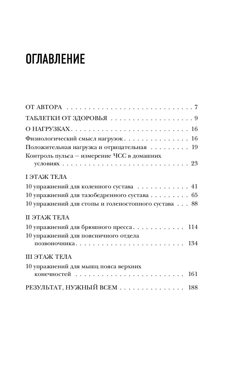 Для удобства читателя тренировки собраны в разделы, охватывающие все основные группы суставов, связок и мышц: для коленного, тазобедренного и голеностопного сустава; для брюшного пресса и поясничного отдела позвоночника; для мышц пояса верхних конечностей.