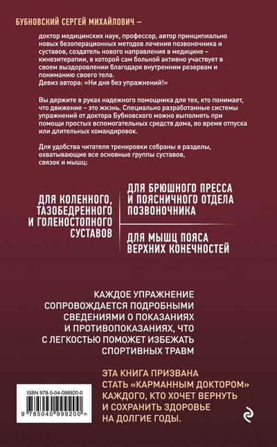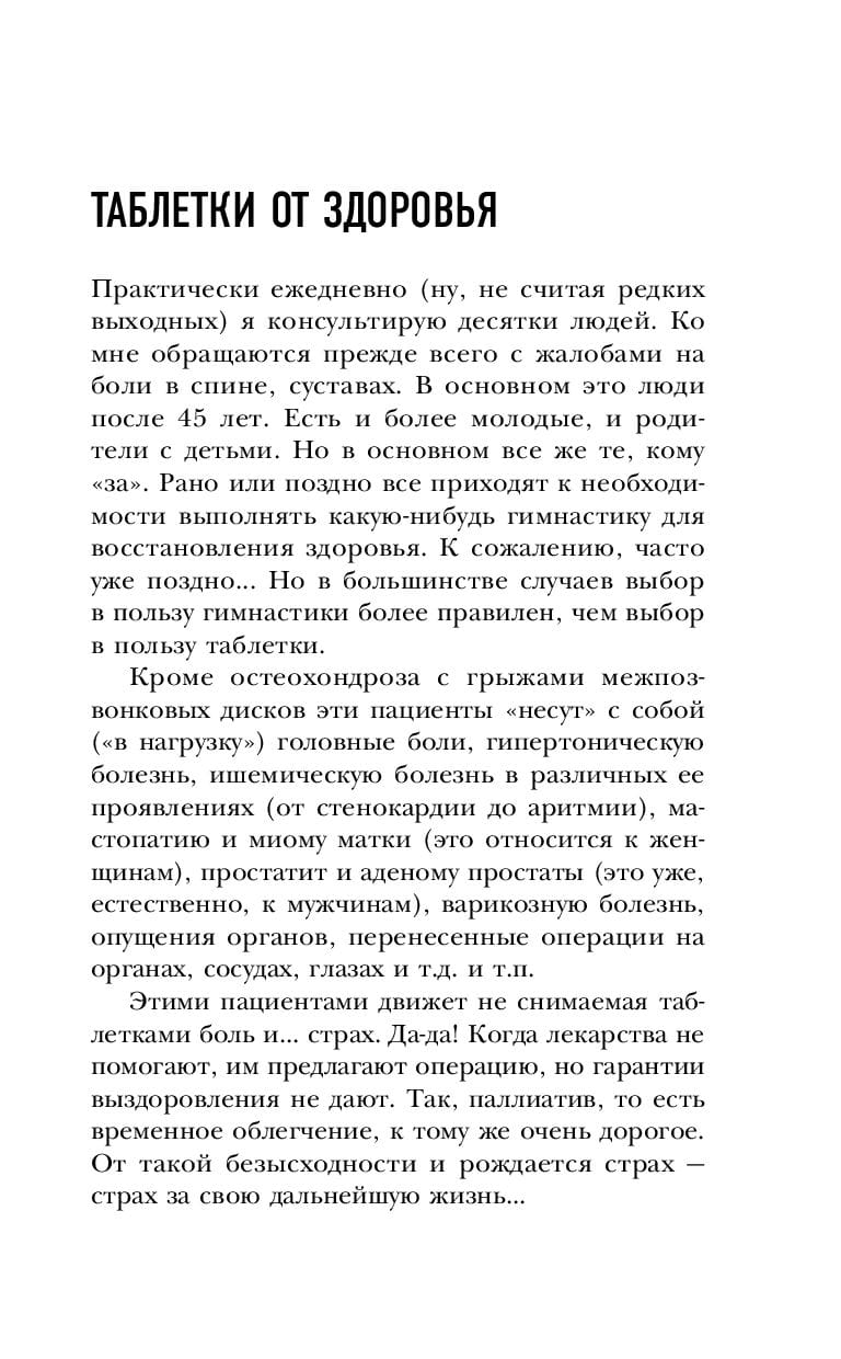Эта книга – надежный помощник для тех, кто понимает, что движение есть жизнь. Специально разработанные системы упражнений от доктора Бубновского можно выполнять при помощи простых вспомогательных средств дома, во время отпуска или длительных командировок.