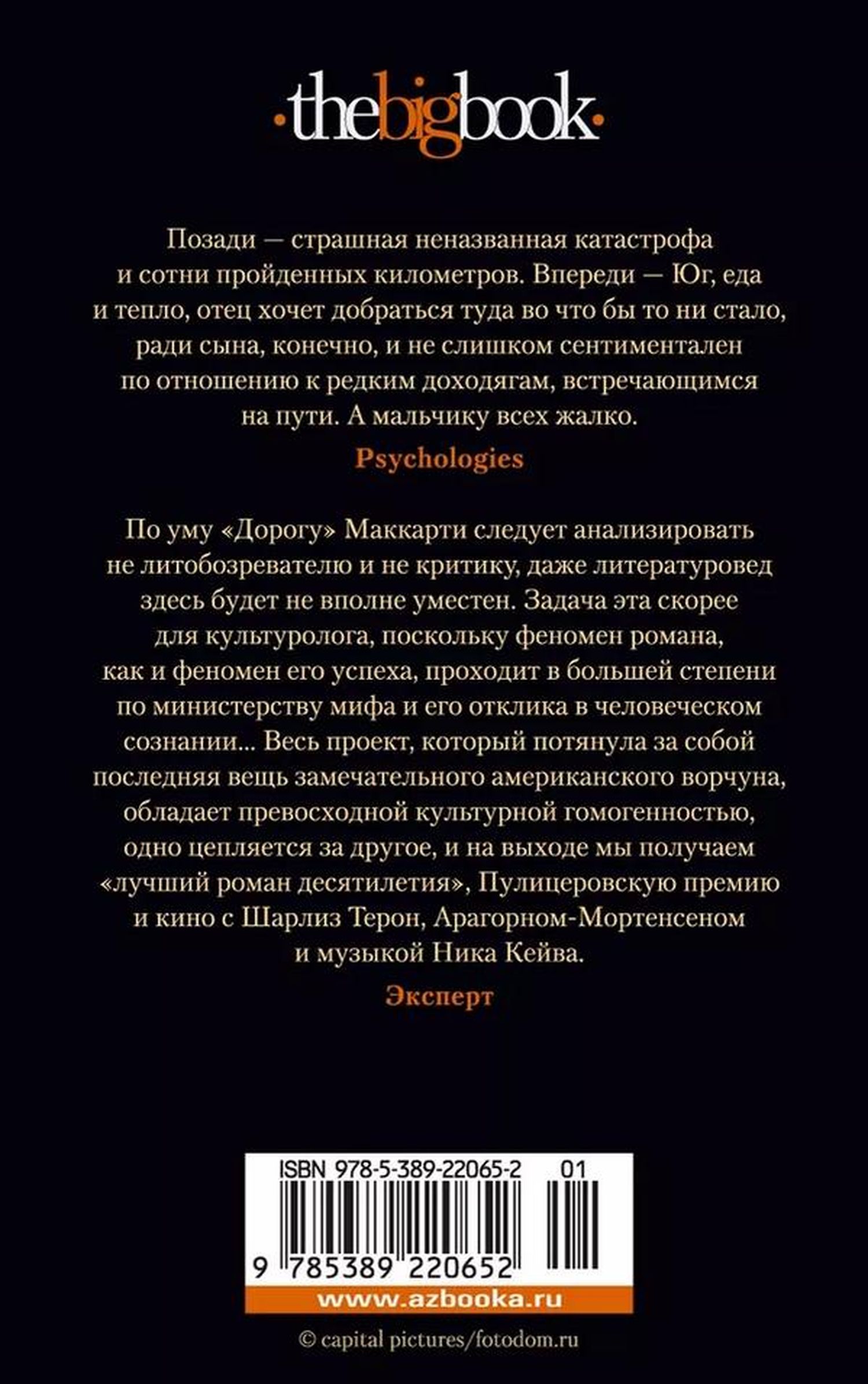 Кормак Маккарти — современный американский классик главного калибра, лауреат Макартуровской стипендии «За гениальность», мастер сложных переживаний и нестандартного синтаксиса, хорошо известный нашему читателю романами «Старикам тут не место», «Кровавый меридиан» и «Пограничной трилогией» («Кони, кони...», «За чертой», «Содом и Гоморра»). Но самый громкий успех ждал поздний роман мэтра: «Дорога» получила Пулицеровскую премию и покорила все мыслимые списки бестселлеров. Не замедлил последовать и фильм, поставленный австралийцем Джоном Хиллкоутом («Предложение», «Самый пьяный округ в мире»); главные роли исполнили Шарлиз Терон и Вигго Мортенсен, музыку к фильму написал Ник Кейв. Итак, после катастрофы Отец и Сын идут через выжженные земли, пересекая континент. Всю книгу пронизывают глубокие, ранящие в самое сердце вопросы. Есть ли смысл жить, если будущего — нет? Вообще нет. Есть ли смысл жить ради детей? Это роман о том, что все в жизни относительно, что такие понятия, как добро и зло, в определенных условиях перестают работать и теряют смысл. Это роман о том, что действительно важно в жизни, и о том, как это ценить. И это также роман о смерти, о том, что все когда-нибудь кончается, и поэтому нужно каждый день принимать таким, какой есть. Нужно просто... жить.