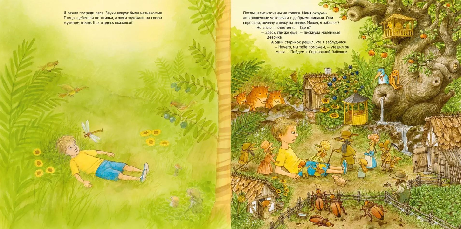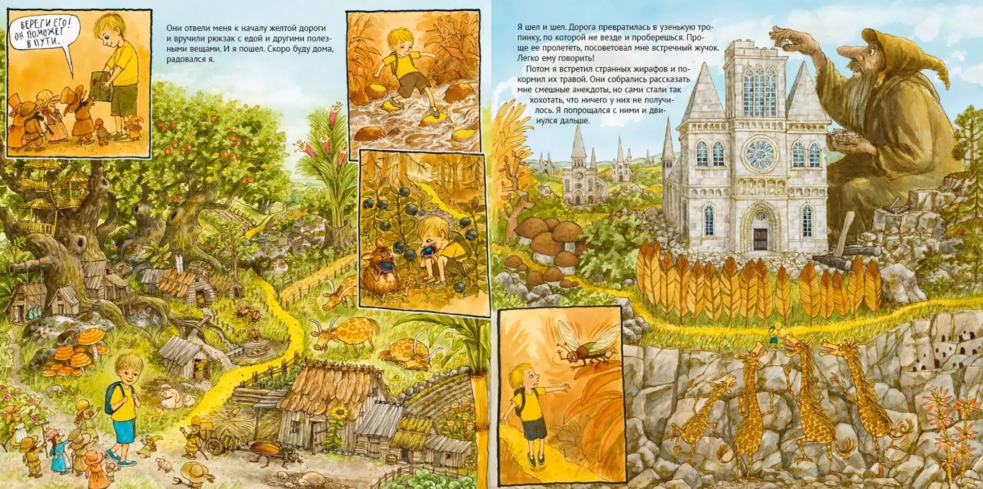 Мальчик очутился в незнакомом месте и не понимает, ни как сюда попал, ни как вернуться назад. Но на подмогу приходят маленькие человечки и Справочная бабушка. Важно все время следовать за желтой полоской: она обязательно выведет к дому. Желтая дорога вьется между скал, где странные жирафы травят анекдоты, ныряет в лес, населенный добрыми троллями, приводит в пустыню, уставленную кораблями и лодками, и превращается в желтую реку - а дальше и море, и остров, и замок принцессы, и лабиринт. На каждом повороте мальчика поджидают не только опасности, но и добрые помощники - то хулиганистые галки, то суровый капитан подводной лодки, то говорящий пес, то художница, рисующая волшебные картины. А в случае чего выручает подаренный человечками необыкновенный рюкзак.
