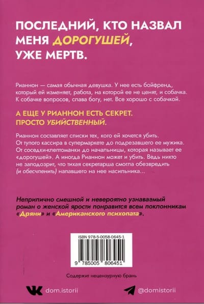 Рианнон составляет списки тех, кого ей хочется убить. От тупого кассира в супермаркете до подрезавшего ее мужика. От соседки-клептоманки до начальницы, которая называет ее «дорогушей». А иногда Рианнон может и убить. Ведь никто не заподозрит, что тихая секретарша смогла обезвредить и (обесчленить) напавшего на нее насильника...