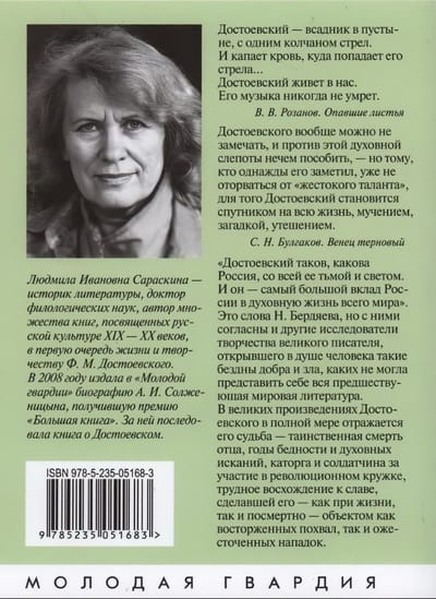 Подробности жизни писателя, вплоть до самых неизвестных и «неудобных», в полной мере отражены в его новой биографии, принадлежащей перу Людмилы Сараскиной — известного историка литературы, автора пятнадцати книг, посвященных Достоевскому и его современникам.
