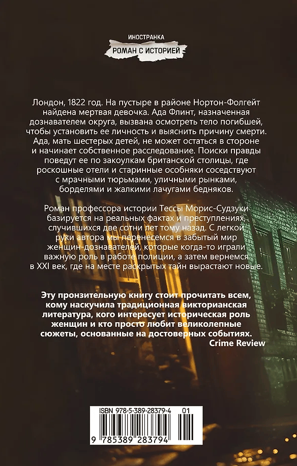 Лондон, начало XIX века. После внезапной смерти Уильяма Флинта, надзирателя округа Нортон-Фолгейт, его жена Ада остается одна с целым выводком детей. Из милости вдову назначают дознавателем при городской управе — работа сложная и невеселая, но Ада старается выполнять ее по совести. И когда на заброшенной конюшне обнаруживается труп восьмилетней девочки, Ада полна решимости выяснить, кем была малышка и кто ее родители. Однако загадки множатся, следствие то и дело заходит в тупик, и Ада вынуждена просить помощи у старого друга, художника Рафаэля Да Силвы…
