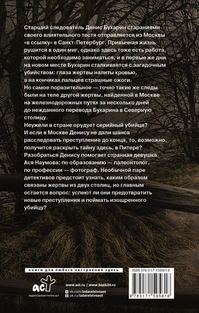 Неужели в стране орудует серийный убийца? И если в Москве Денису не дали шанса расследовать преступление до конца, то, возможно, получится раскрыть тайну здесь, в Питере? Разобраться Денису помогает странная девушка Ася Наумова: по образованию — палеонтолог, по профессии — фотограф. Необычной паре детективов предстоит узнать, каким образом связаны жертвы из двух столиц, но главным остается вопрос: успеют ли они предотвратить новые преступления и поймать изощренного убийцу?