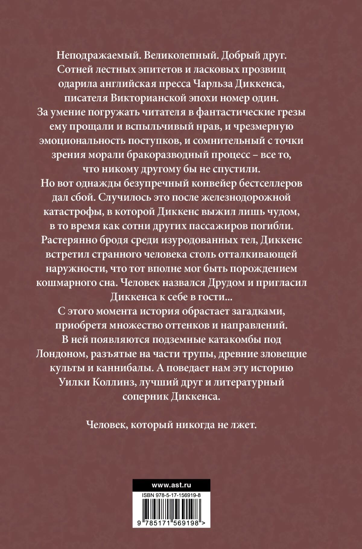С этого момента история обрастает загадками, приобретя множество оттенков и направлений. В ней появляются подземные катакомбы под Лондоном, разъятые на части трупы, древние зловещие культы и каннибалы. А поведает нам эту историю Уилки Коллинз, лучший друг и литературный соперник Диккенса.