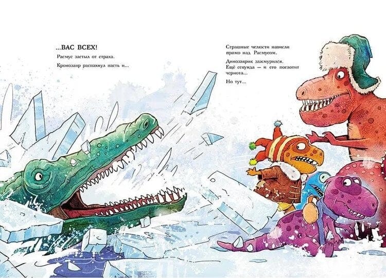 Ранним субботним утром Трим разбудил Расмуса и потащил на улицу. А там впервые за тысячу лет выпал снег! Такого никто из динозавриков ещё никогда не видел. Папа Рекс предложил устроить соревнования по зимней рыбалке, и весёлая компания отправилась на Большое озеро. Оказалось, что ловить рыбу подо льдом совсем непросто, и на крючок постоянно попадалось что-то не то. А потом и вовсе попался кронозавр — самое кровожадное подводное чудище на свете! И неизвестно, чем бы это закончилось, если бы не бабушка Рекс, которая бросилась на защиту любимого внука и обратила в бегство грозного кронозавра. О приключениях Расмуса и Трима читайте в других книгах серии «Друзья - динозаврики «: «Яйцо», «Заплыв», «Поход», «Испытание», «Гигантский осьминог».