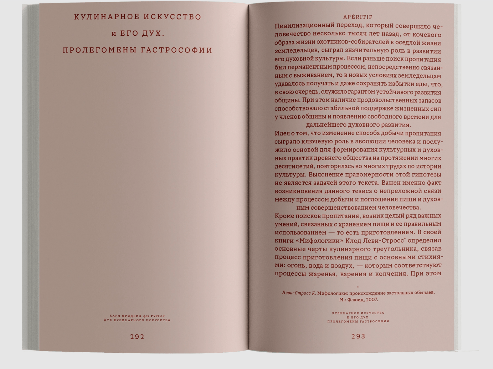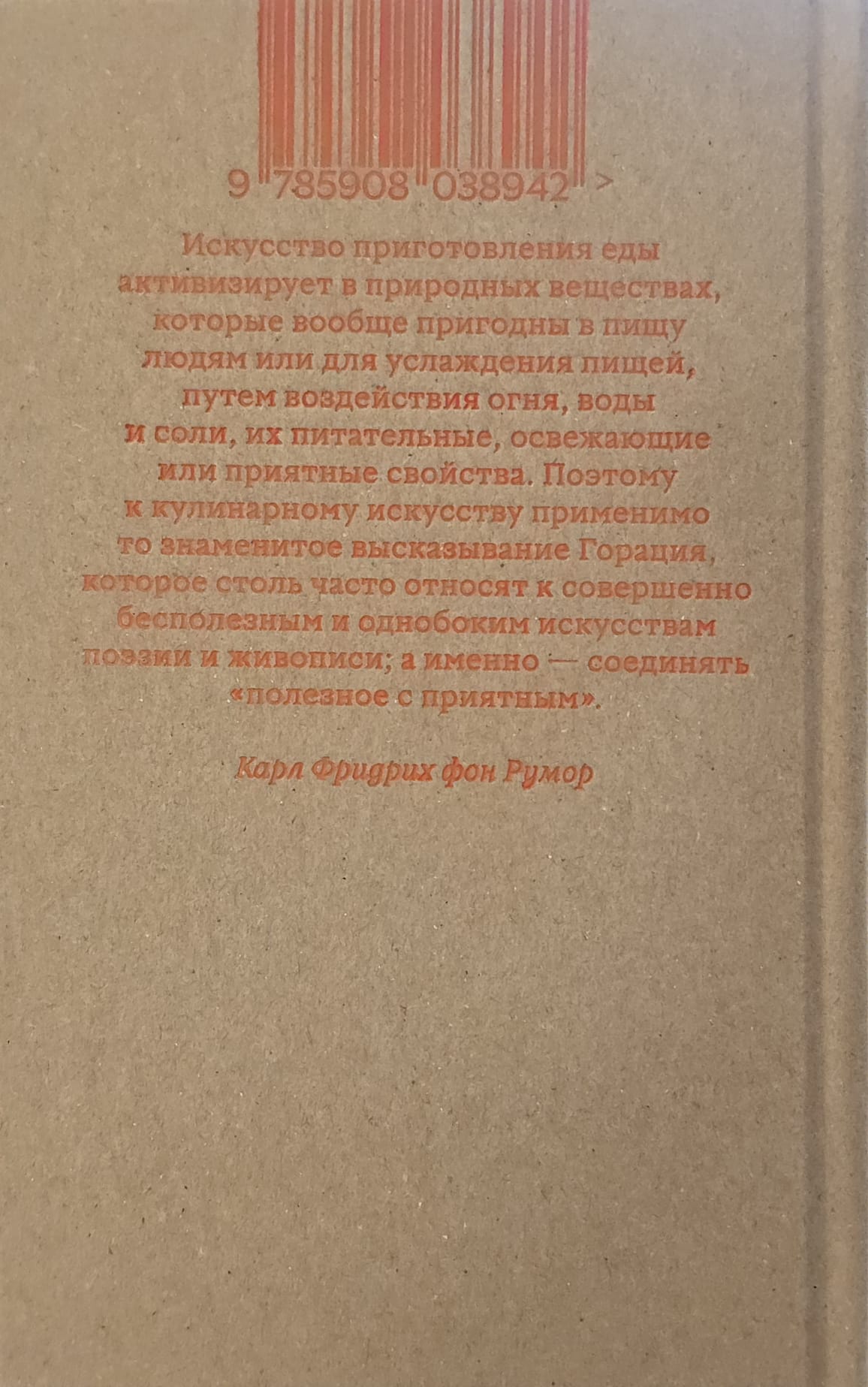 «Дух кулинарного искусства» (1822) — книга немецкого литератора, художника, коллекционера и мецената Карла Фридриха фон Румора (1785–1843), с трудом поддающаяся жанровому определению. Это трактат по практической метафизике питания, соединяющий в себе подробные описания различных видов блюд и способов их приготовления, философские и социологические наблюдения, а также утопические идеи по переустройству общества. Автор ставил перед собой амбициозную задачу выработки нового подхода к искусству кулинарии, где философия и гастрономия объединяются в общую категорию — гастрософию. Вдохновившись трудами Платона, Горация, Канта, Шеллинга и других мыслителей разных эпох, Румор рассматривает профессию повара как одно из проявлений творческого духа и обосновывает элементарную теорию кулинарной практики. Заслуга Румора заключается в том, что он впервые в западной философии формулирует систематику кулинарного искусства и делает приготовление пищи прямым предметом эстетики.