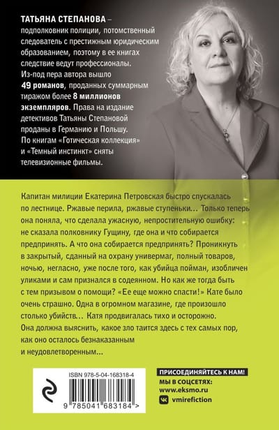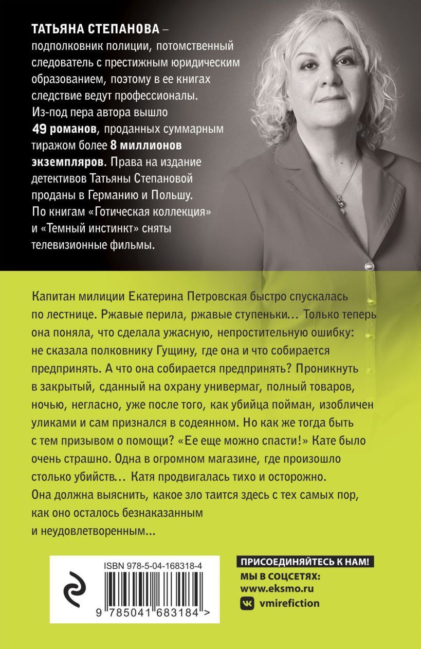 Капитан милиции Екатерина Петровская быстро спускалась по лестнице. Ржавые перила, ржавые ступеньки… Только теперь она поняла, что сделала ужасную, непростительную ошибку: не сказала полковнику Гущину, где она и что собирается предпринять. А что она собирается предпринять? Проникнуть в закрытый, сданный на охрану универмаг, полный товаров, ночью, негласно, уже после того, как убийца пойман, изобличен уликами и сам признался в содеянном. Но как же тогда быть с тем призывом о помощи? «Ее еще можно спасти!» Кате было очень страшно. Одна, в огромном магазине, где произошло столько убийств… Катя продвигалась тихо и осторожно. Она должна выяснить, какое зло таится здесь с тех самых пор, как оно осталось безнаказанным и неудовлетворенным?.. Романы потомственного следователя Татьяны Степановой позволяют читателю побывать в литературной «комнате страха». Таинственные убийства, почти осязаемая атмосфера преступления, томительное и тревожное ожидание чего-то неведомого, пугающего... Все это Татьяне Степановой удается воспроизвести просто блестяще. Случайные встречи, повседневные дела, незначительные детали изображаются в ее детективах в каком-то особом, драматическом свете, словно безобидный весенний луг перед стремительно надвигающейся грозой.