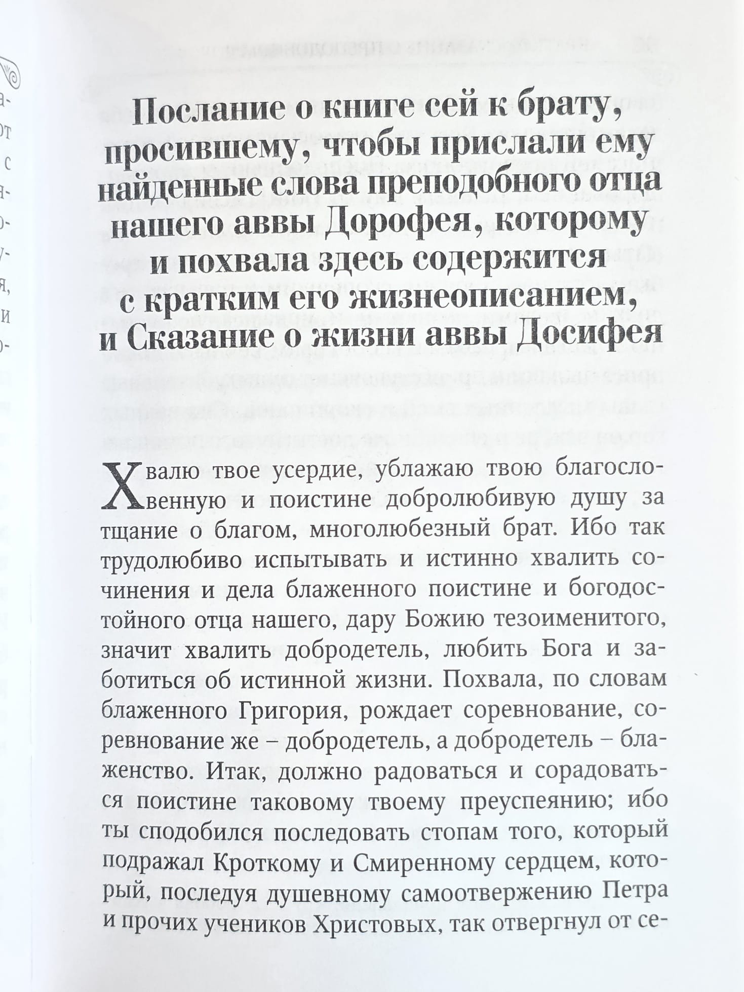Ученик прп. Иоанна Пророка, авва Дорофей юношей отличался большим прилежанием к изучению наук, а затем стал ревностным иноком в палестинском монастыре. Следуя заповедям Спасителя, авва Дорофей нередко повторяет, что духовная жизнь немыслима без любви к Богу и людям, в сочетании с послушанием и смирением.