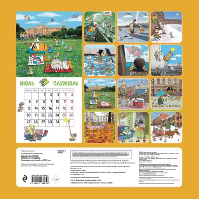 Все приключения любопытных котов в этом календаре связаны со знаковыми местами Санкт-Петербурга. Все рисунки сюжетные, с юмором и большим количеством деталей, словно это виммельбухи.