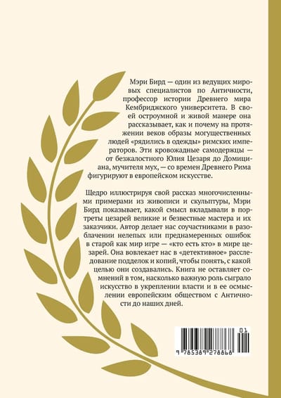 Историк Мэри Бирд, автор бестселлера «SPQR: История Древнего Рима», на этот раз погружает нас в захватывающий рассказ о том, как на протяжении 2000 лет образы римских императоров влияли на европейское искусство и даже политику. Великолепно иллюстрированная книга предлагает путешествие по европейской истории искусства от Античности до наших дней. Мэри Бирд исследует, как сформировался изобразительный «канон» двенадцати цезарей, а затем прослеживает, как его переосмысливали, видоизменяли, а также, вольно или невольно, делали ошибки, путали императоров, их жен и матерей. Автор раскрывает все звенья своего «детективного» расследования, разрешившего целый ряд загадок и ошибок в истории искусства. Мэри Бирд реконструирует исчезнувшие навсегда прославленные серии картин и гобеленов и раскрывает подлинную личность целого ряда произведений.
