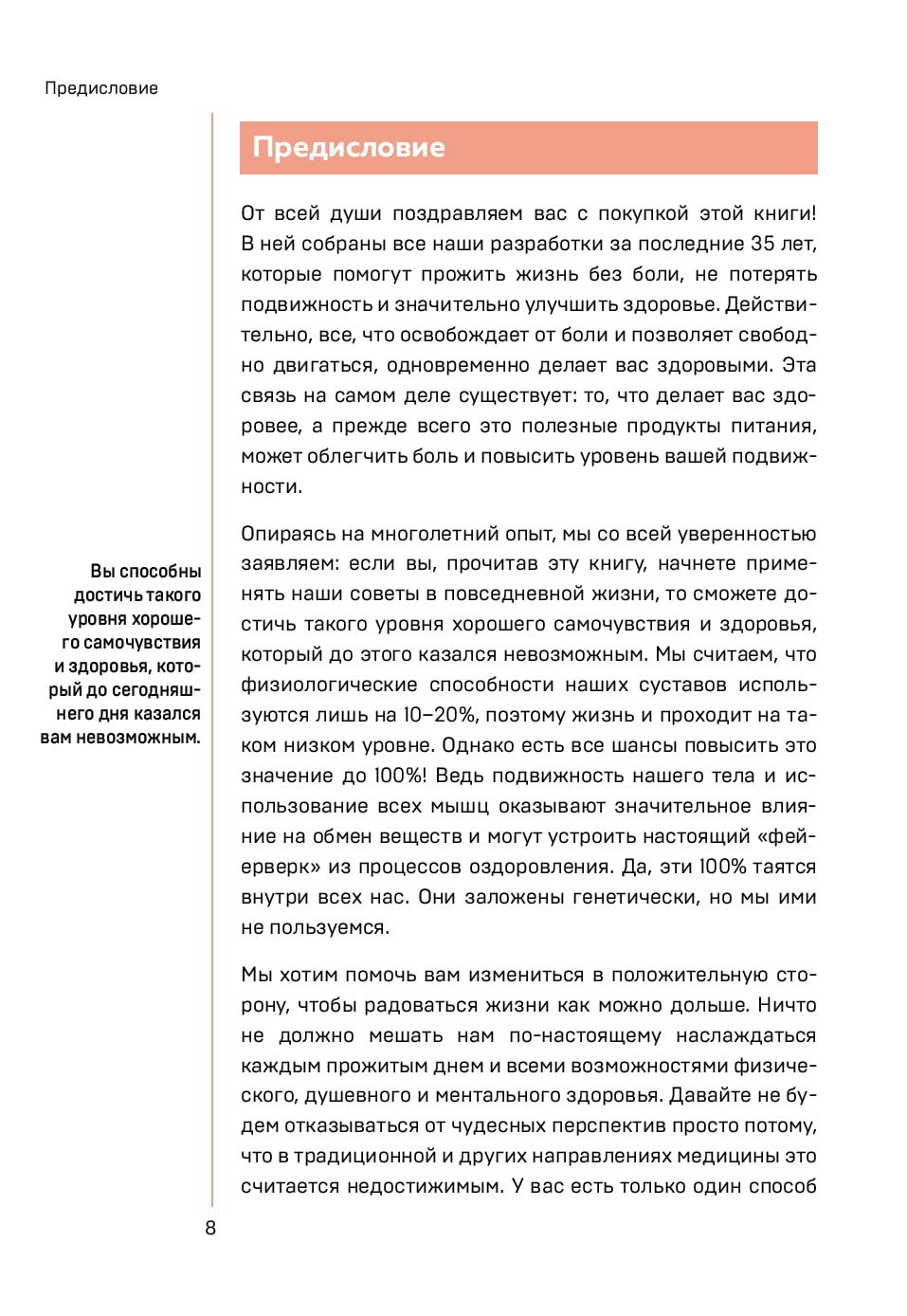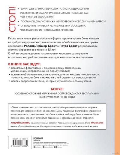 «Наша методика подходит для самолечения или прекрасно дополнит и расширит традиционную схему вашего лечения. Мы уверены, что с помощью упражнений из этой книги каждый сможет жить без боли, оставаться здоровыми и гибкими до самой старости. Вы еще будете с внуками в футбол играть — так мы всегда говорим нашим пациентам». — Р. Либшер-Брахт