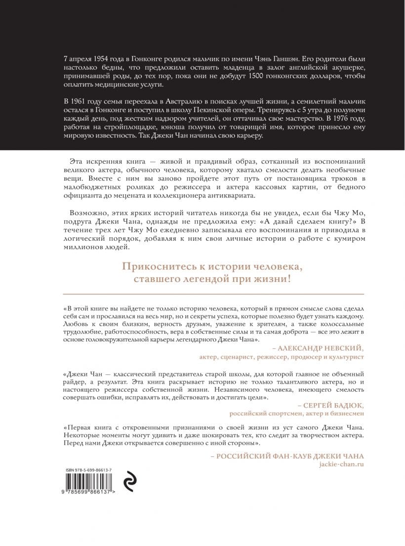 Эта искренняя книга - живой и правдивый образ, сотканный из воспоминаний великого актера, обычного человека, которому хватало смелости делать необычные вещи. Вместе с ним вы заново пройдете этот путь - от постановщика трюков малобюджетных роликов до режиссера и актера кассовых картин, от бедного официанта до мецената и коллекционера антиквариата.