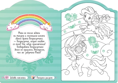 В книге вас ждет увлекательная сказочная история о приключениях очаровательных единорогов Майи и Попрыгунчика и 8 больших картинок, которые нужно раскрасить, а затем украсить наклейками. В конце книги художника ждет сюрприз – красочный диплом от Майи и ее друзей.