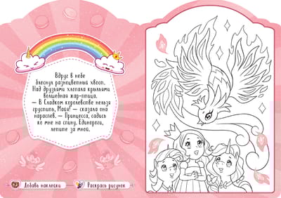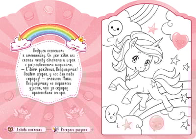 В книге вас ждет увлекательная сказочная история о приключениях очаровательных единорогов Майи и Попрыгунчика и 8 больших картинок, которые нужно раскрасить, а затем украсить наклейками. В конце книги художника ждет сюрприз – красочный диплом от Майи и ее друзей.