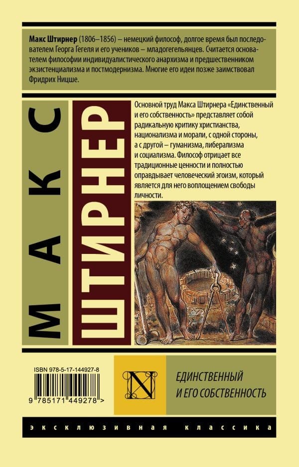 Макс Штирнер (1806–1856) – немецкий философ, долгое время был последователем Георга Гегеля и его учеников – младогегельянцев. Считается основателем философии индивидуалистического анархизма и предшественником экзистенциализма и постмодернизма. Многие его идеи позже заимствовал Фридрих Ницше. Основной труд Макса Штирнера «Единственный и его собственность» представляет собой радикальную критику христианства, национализма и морали, с одной стороны, а с другой – гуманизма, либерализма и социализма. Философ отрицает все традиционные ценности и полностью оправдывает человеческий эгоизм, который является для него воплощением свободы личности.