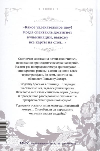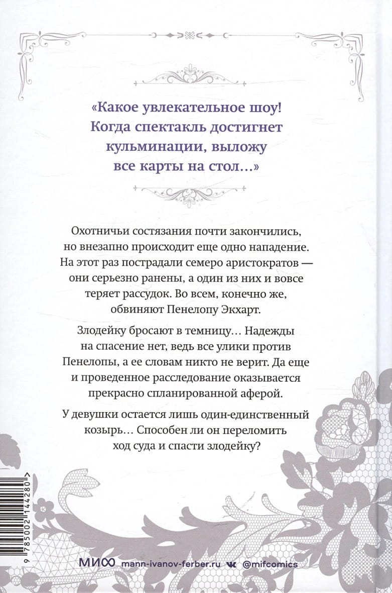 Безумная игра продолжается, и в этот раз Пенелопа Экхарт должна бороться за свою свободу. Ведь квест с охотничьими состязаниями омрачает новое жестокое нападение. Пострадали семеро аристократов: они серьезно ранены, а один даже теряет рассудок. Конечно же, во всем обвиняют Пенелопу. Злодейку бросают в темницу. Надежды на спасение нет: все улики против нее, а словам девушки никто не верит. Еще и проведенное расследование оказывается прекрасно спланированной аферой. У Пенелопы остается лишь один-единственный козырь… Но способен ли он переломить ход суда и спасти злодейку? В пятый том манхвы вошли эпизоды 81-100.