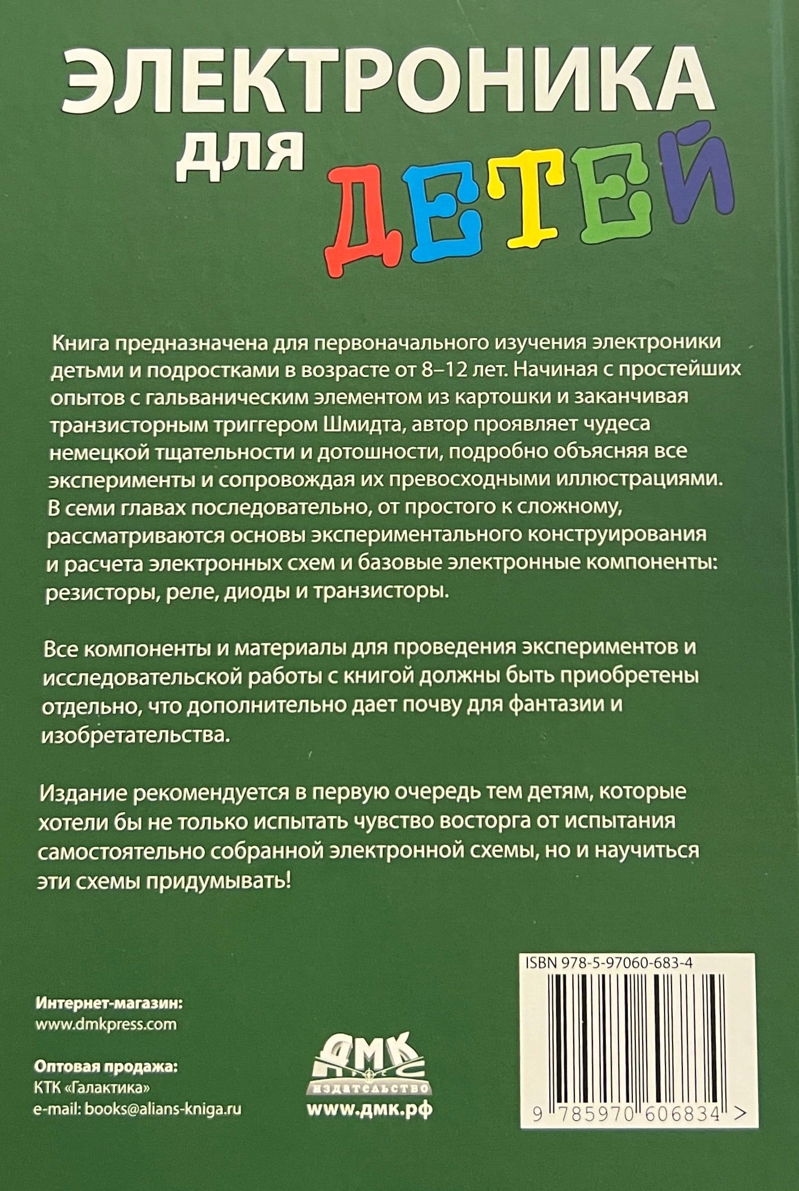 Книга предназначена для первоначального изучения электроники детьми и подростками в возрасте от 8–12 лет. Начиная с простейших опытов с гальваническим элементом из картошки и заканчивая транзисторным триггером Шмидта, автор проявляет чудеса немецкой тщательности и дотошности, подробно объясняя все эксперименты и сопровождая их превосходными иллюстрациями.