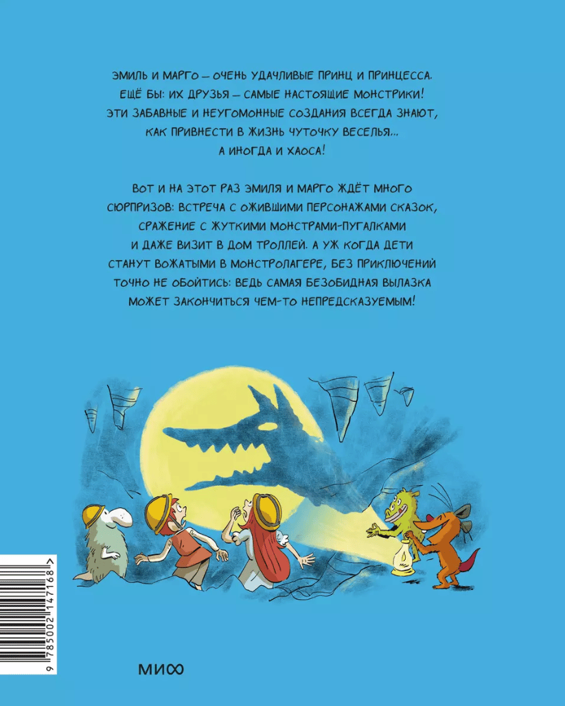 Эмиль и Марго становятся вожатыми в Монстролагере. Вот только управлять монстриками — задача не из простых. Эмиль и Марго — очень удачливые принц и принцесса. Ещё бы: их друзья — самые настоящие монстрики. Эти забавные и неугомонные создания всегда знают, как привнести в жизнь немного веселья. а иногда и хаоса. Вот и на этот раз Эмиля и Марго ждет много сюрпризов: встреча с ожившими персонажами сказок, сражение с жуткими монстрами-пугалками и даже визит в дом троллей. А уж когда дети решат поработать вожатыми в Монстролагере, без приключений точно не обойтись: ведь самая безобидная вылазка может закончиться чем-то непредсказуемым. Фишки книги: