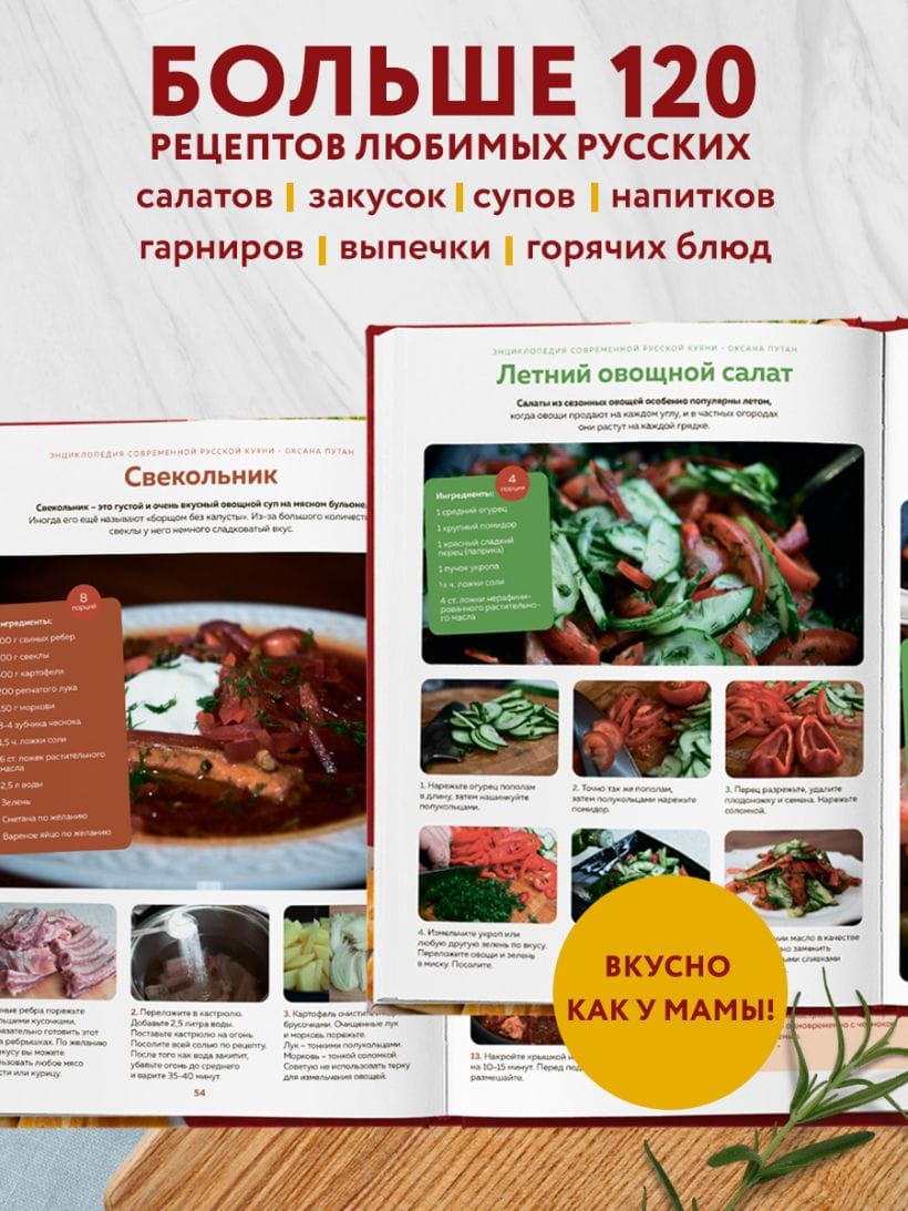 Все рецепты из этой книги прошли испытание на тысячах кухонь. Они те самые, домашние, по которым готовили ваши мамы и бабушки. Автор книги Оксана Путан — профессиональный повар, автор кулинарных книг и известный кулинарный блогер. В этом самом подробном учебнике по русской домашней кухне в картинках она очень подробно описывает, как готовить самые простые и популярные русские супы, пирожки, салаты, котлеты и гарниры. Даже если вы ни разу в жизни не подходили к плите — по этим рецептам у вас получится приготовить блюда с первого раза. Если вы не новичок в кухонных делах, то, может, взгляд автора на привычный кухонный процесс и способность отбросить лишнее вам тоже понравятся. Автор переработала и разложила по полочкам весь процесс приготовления. И не только супы и салаты, но и ароматный хлеб, блины, пельмени и пироги, торты и домашние напитки покорятся вам без труда и с огромным удовольствием. Готовьте просто и легко, по поводу и каждый день. Балуйте родных, зовите гостей. С этими рецептами вы полюбите готовить!